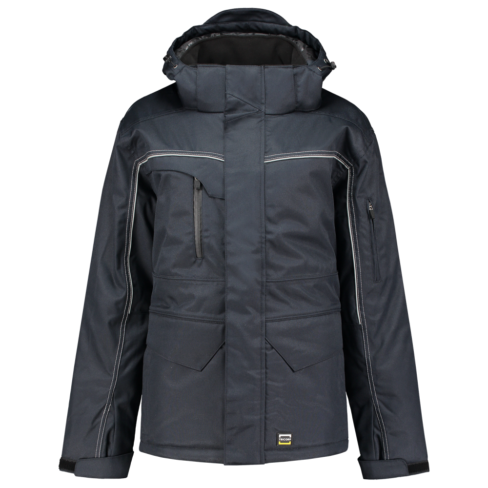 De parka is uitgevoerd met getapete naden, waterafstotende ritsen en tricot windvangers in de mouwen. Verder beschikt deze populaire Tricorp jas over verstelbare manchetten (d.m.v. klittenband), een gelamineerde blokrits met stormflap, een verlengd achterpand dat in en uit te klappen is en een baardkapje.